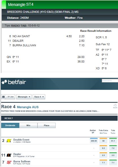 No, I was checking results of a system and when I came across the Betfair result, I thought, "there goes that system!". I just couldn't believe the result, although with the number of longshots getting up of late, maybe I could? Still in denial I checked another Betfair portal, still the same, then went to Tatts, Unibet and The Harness Association and found a different result.