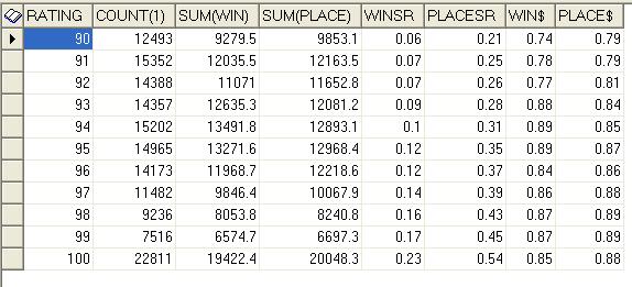 In other words say you have a selection method that is showing near to break even, then you introduce a further filter, i.e. no bet if less than 97 rating (example) you will find an immediate improvement in S/R.