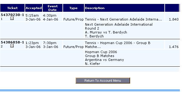 Moodie lost 7-6 6-4 Good fight by the South African, he was playing with a shoulder injury in the second set and managed to hold serve 4 times out of 5. As suspected the match was much closer than the odds predicted, and although bookies don't care whether its close or not, I'm happy with the result. No pressure to keep a perfect record now, haha. bobjoe66 - Thanks for the kind words, good luck with the Hrbaty bet. Nice to have someone contributing to the thread. Today we have: Tomas Berdych over Andy Murray - 0.5 Units (Small play) As posted yesterday Also looking into Kiefer over Wessels at Hopman Cup and maybe even Dent over Johansson. Will post the plays (if any) after analysis. Good luck and happy punting Betsy |
